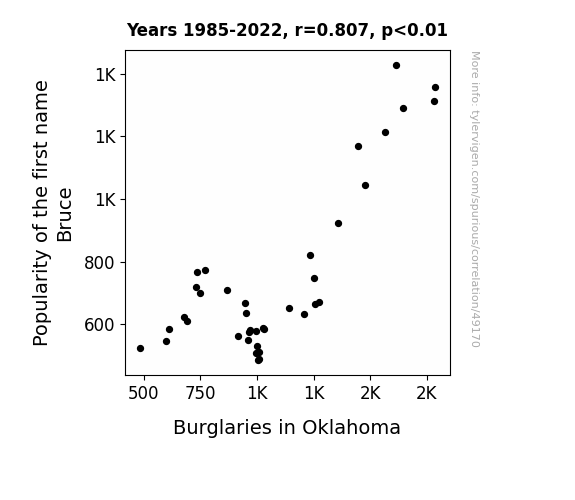 This means 65.1% of the change in the one variable (i.e., Burglaries in Oklahoma) is predictable based on the change in the other (i.e., Popularity of the first name Bruce) over the 38 years from 1985 through 2022.