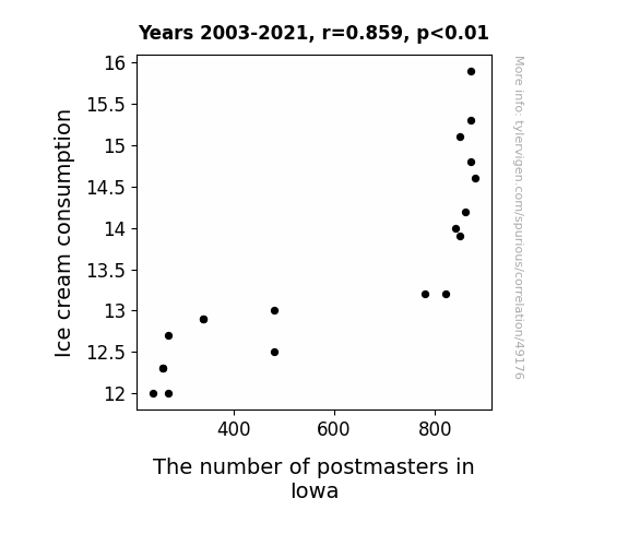 This means 73.8% of the change in the one variable (i.e., The number of postmasters in Iowa) is predictable based on the change in the other (i.e., Ice cream consumption) over the 19 years from 2003 through 2021.