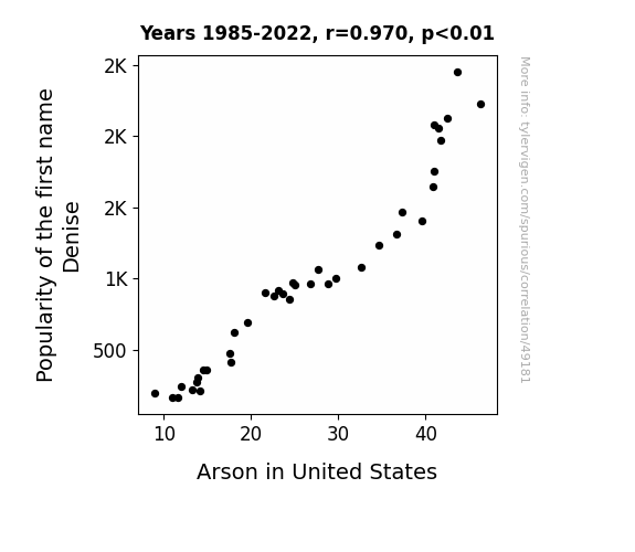 This means 94% of the change in the one variable (i.e., Arson in United States) is predictable based on the change in the other (i.e., Popularity of the first name Denise) over the 38 years from 1985 through 2022.