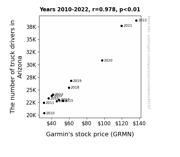 This means 95.7% of the change in the one variable (i.e., Garmin's stock price (GRMN)) is predictable based on the change in the other (i.e., The number of truck drivers in Arizona) over the 13 years from 2010 through 2022.