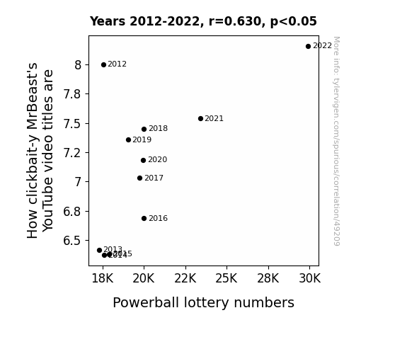 This means 39.7% of the change in the one variable (i.e., Powerball lottery numbers) is predictable based on the change in the other (i.e., How clickbait-y MrBeast's YouTube video titles are) over the 11 years from 2012 through 2022.