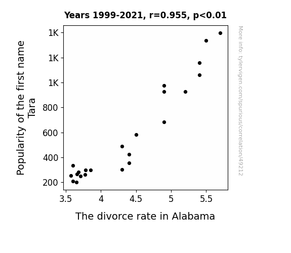 This means 91.2% of the change in the one variable (i.e., The divorce rate in Alabama) is predictable based on the change in the other (i.e., Popularity of the first name Tara) over the 23 years from 1999 through 2021.