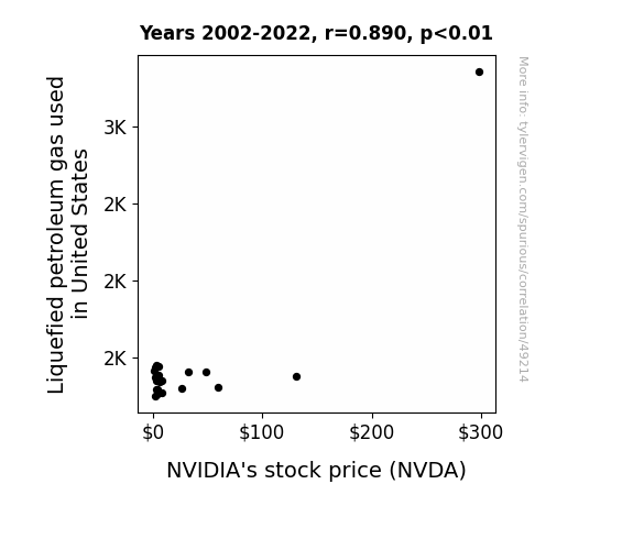 This means 79.3% of the change in the one variable (i.e., NVIDIA's stock price (NVDA)) is predictable based on the change in the other (i.e., Liquefied petroleum gas used in United States) over the 21 years from 2002 through 2022.