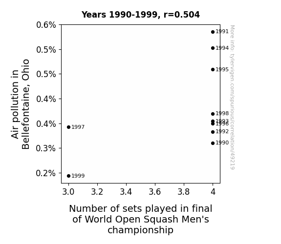 This means 25.4% of the change in the one variable (i.e., Number of sets played in final of World Open Squash Men's championship) is predictable based on the change in the other (i.e., Air pollution in Bellefontaine, Ohio) over the 10 years from 1990 through 1999.