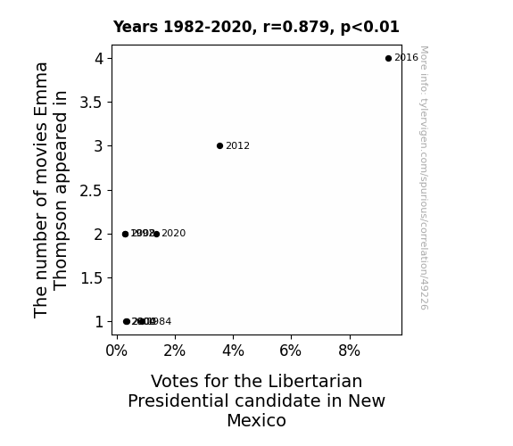 This means 77.2% of the change in the one variable (i.e., Votes for the Libertarian Presidential candidate in New Mexico) is predictable based on the change in the other (i.e., The number of movies Emma Thompson appeared in) over the 8 years from 1982 through 2020.