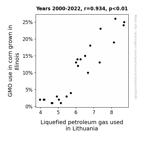 This means 87.2% of the change in the one variable (i.e., Liquefied petroleum gas used in Lithuania) is predictable based on the change in the other (i.e., GMO use in corn grown in Illinois) over the 23 years from 2000 through 2022.
