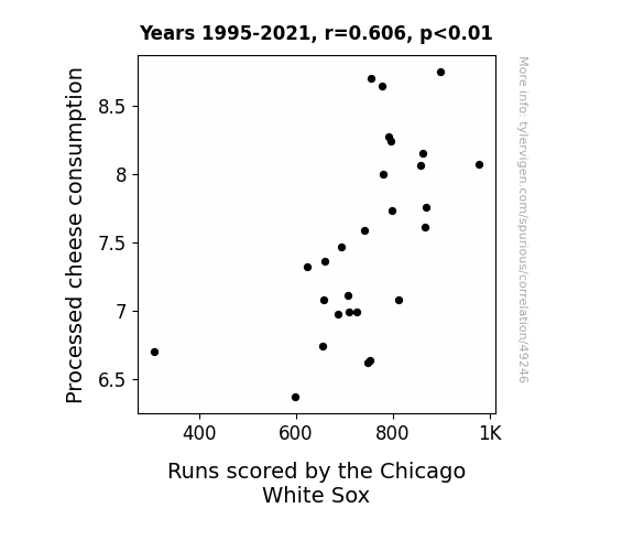 This means 36.7% of the change in the one variable (i.e., Runs scored by the Chicago White Sox) is predictable based on the change in the other (i.e., Processed cheese consumption) over the 27 years from 1995 through 2021.