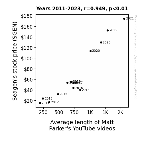 This means 90% of the change in the one variable (i.e., Average length of Matt Parker's YouTube videos) is predictable based on the change in the other (i.e., Seagen's stock price (SGEN)) over the 13 years from 2011 through 2023.