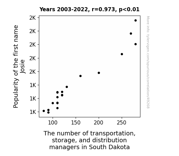 This means 94.6% of the change in the one variable (i.e., The number of transportation, storage, and distribution managers in South Dakota) is predictable based on the change in the other (i.e., Popularity of the first name Josie) over the 20 years from 2003 through 2022.