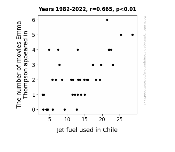 This means 44.3% of the change in the one variable (i.e., Jet fuel used in Chile) is predictable based on the change in the other (i.e., The number of movies Emma Thompson appeared in) over the 41 years from 1982 through 2022.