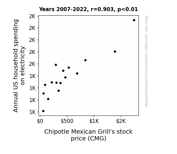This means 81.5% of the change in the one variable (i.e., Chipotle Mexican Grill's stock price (CMG)) is predictable based on the change in the other (i.e., Annual US household spending on electricity) over the 16 years from 2007 through 2022.
