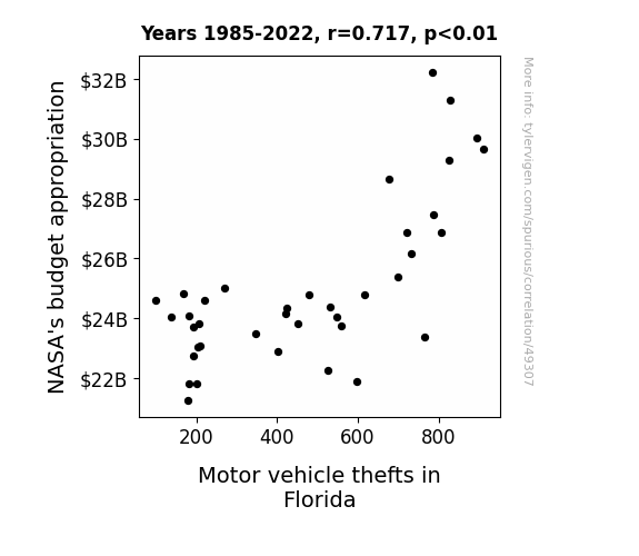 This means 51.4% of the change in the one variable (i.e., Motor vehicle thefts in Florida) is predictable based on the change in the other (i.e., NASA's budget appropriation) over the 38 years from 1985 through 2022.