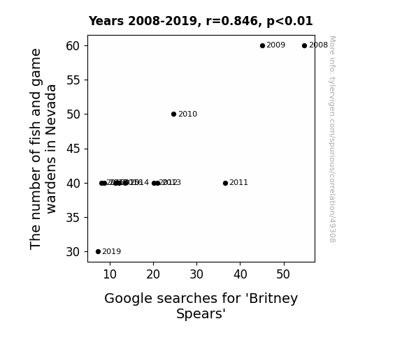 This means 71.6% of the change in the one variable (i.e., Google searches for 'Britney Spears') is predictable based on the change in the other (i.e., The number of fish and game wardens in Nevada) over the 12 years from 2008 through 2019.
