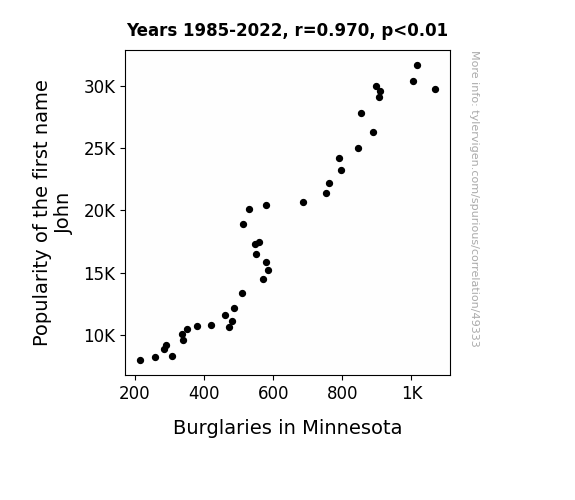 This means 94% of the change in the one variable (i.e., Burglaries in Minnesota) is predictable based on the change in the other (i.e., Popularity of the first name John) over the 38 years from 1985 through 2022.