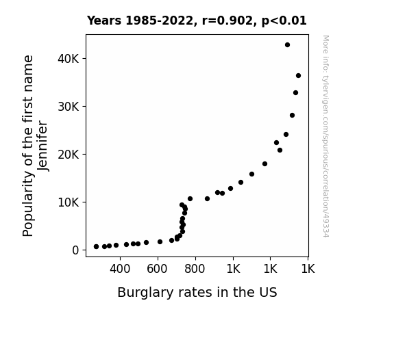 This means 81.4% of the change in the one variable (i.e., Burglary rates in the US) is predictable based on the change in the other (i.e., Popularity of the first name Jennifer) over the 38 years from 1985 through 2022.