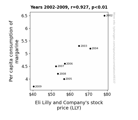 This means 85.8% of the change in the one variable (i.e., Eli Lilly and Company's stock price (LLY)) is predictable based on the change in the other (i.e., Per capita consumption of margarine) over the 8 years from 2002 through 2009.
