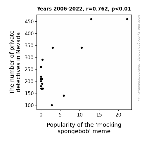 This means 58.1% of the change in the one variable (i.e., Popularity of the 'mocking spongebob' meme) is predictable based on the change in the other (i.e., The number of private detectives in Nevada) over the 17 years from 2006 through 2022.