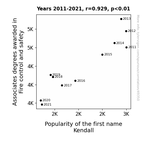 This means 86.3% of the change in the one variable (i.e., Popularity of the first name Kendall) is predictable based on the change in the other (i.e., Associates degrees awarded in Fire control and safety) over the 11 years from 2011 through 2021.