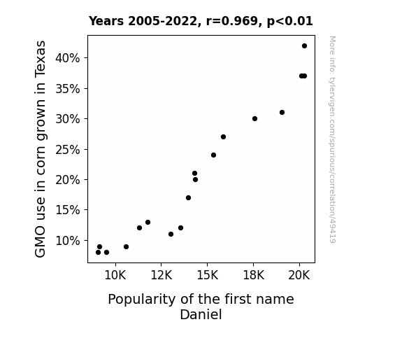 This means 93.8% of the change in the one variable (i.e., Popularity of the first name Daniel) is predictable based on the change in the other (i.e., GMO use in corn grown in Texas) over the 18 years from 2005 through 2022.