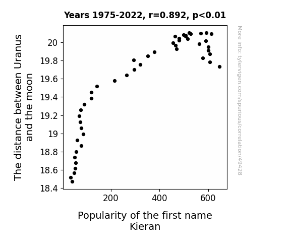 This means 79.5% of the change in the one variable (i.e., Popularity of the first name Kieran) is predictable based on the change in the other (i.e., The distance between Uranus and the moon) over the 48 years from 1975 through 2022.