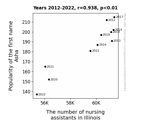 This means 88% of the change in the one variable (i.e., The number of nursing assistants in Illinois) is predictable based on the change in the other (i.e., Popularity of the first name Asha) over the 11 years from 2012 through 2022.