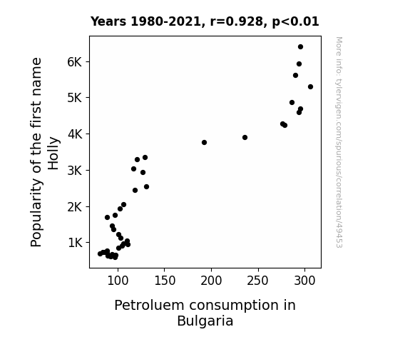 This means 86.1% of the change in the one variable (i.e., Petroluem consumption in Bulgaria) is predictable based on the change in the other (i.e., Popularity of the first name Holly) over the 42 years from 1980 through 2021.