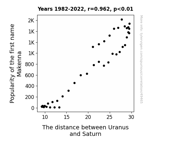 This means 92.5% of the change in the one variable (i.e., The distance between Uranus and Saturn) is predictable based on the change in the other (i.e., Popularity of the first name Makenna) over the 41 years from 1982 through 2022.