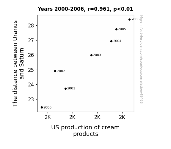 This means 92.4% of the change in the one variable (i.e., US production of cream products) is predictable based on the change in the other (i.e., The distance between Uranus and Saturn) over the 7 years from 2000 through 2006.