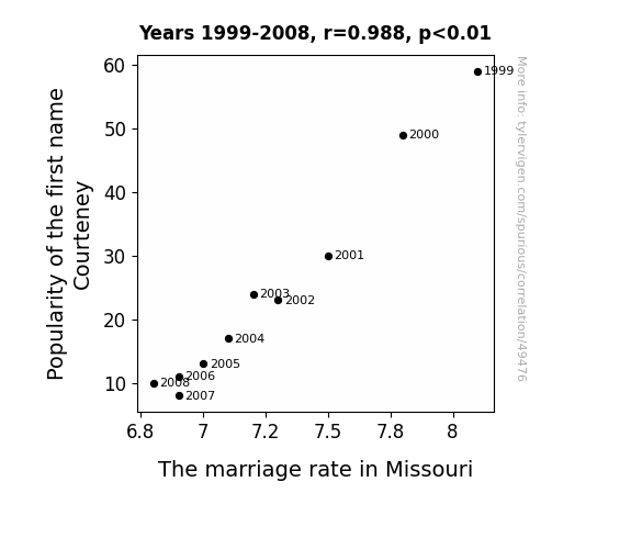 A linear line chart with years as the X-axis and two variables on the Y-axis. The first variable is Popularity of the first name Courteney and the second variable is The marriage rate in Missouri.  The chart goes from 1999 to 2008, and the two variables track closely in value over that time. Small Image