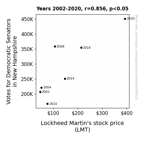 This means 73.2% of the change in the one variable (i.e., Lockheed Martin's stock price (LMT)) is predictable based on the change in the other (i.e., Votes for Democratic Senators in New Hampshire) over the 7 years from 2002 through 2020.