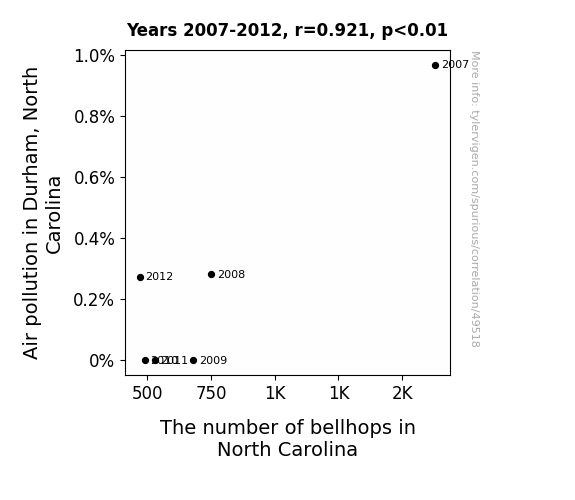 This means 84.8% of the change in the one variable (i.e., The number of bellhops in North Carolina) is predictable based on the change in the other (i.e., Air pollution in Durham, North Carolina) over the 6 years from 2007 through 2012.