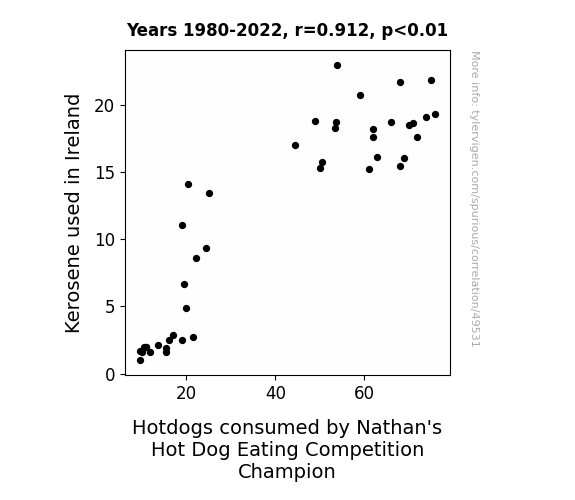 This means 83.2% of the change in the one variable (i.e., Hotdogs consumed by Nathan's Hot Dog Eating Competition Champion) is predictable based on the change in the other (i.e., Kerosene used in Ireland) over the 43 years from 1980 through 2022.