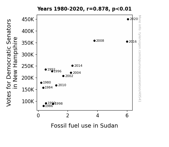 This means 77.2% of the change in the one variable (i.e., Fossil fuel use in Sudan) is predictable based on the change in the other (i.e., Votes for Democratic Senators in New Hampshire) over the 14 years from 1980 through 2020.