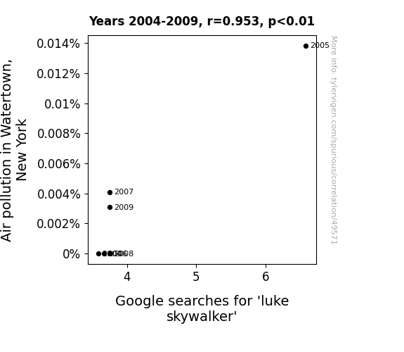 This means 90.7% of the change in the one variable (i.e., Google searches for 'luke skywalker') is predictable based on the change in the other (i.e., Air pollution in Watertown, New York) over the 6 years from 2004 through 2009.