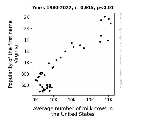 This means 83.6% of the change in the one variable (i.e., Average number of milk cows in the United States) is predictable based on the change in the other (i.e., Popularity of the first name Virginia) over the 43 years from 1980 through 2022.