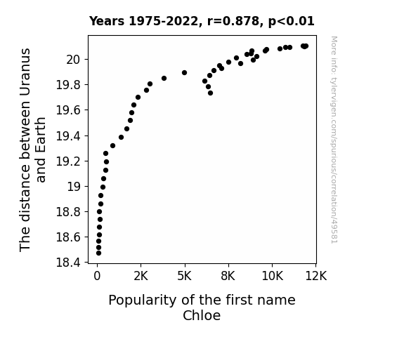 This means 77.1% of the change in the one variable (i.e., Popularity of the first name Chloe) is predictable based on the change in the other (i.e., The distance between Uranus and Earth) over the 48 years from 1975 through 2022.