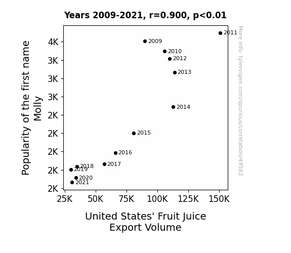 This means 81% of the change in the one variable (i.e., United States' Fruit Juice Export Volume) is predictable based on the change in the other (i.e., Popularity of the first name Molly) over the 13 years from 2009 through 2021.