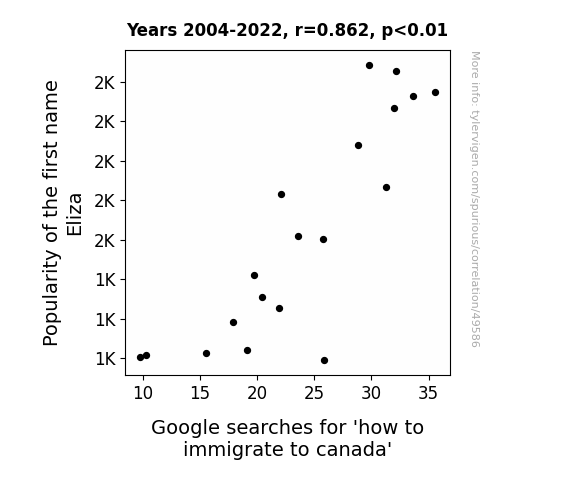 This means 74.3% of the change in the one variable (i.e., Google searches for 'how to immigrate to canada') is predictable based on the change in the other (i.e., Popularity of the first name Eliza) over the 19 years from 2004 through 2022.