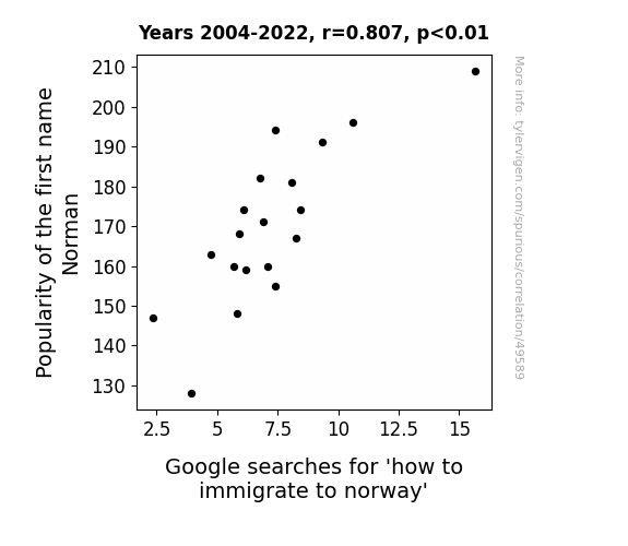 This means 65.2% of the change in the one variable (i.e., Google searches for 'how to immigrate to norway') is predictable based on the change in the other (i.e., Popularity of the first name Norman) over the 19 years from 2004 through 2022.