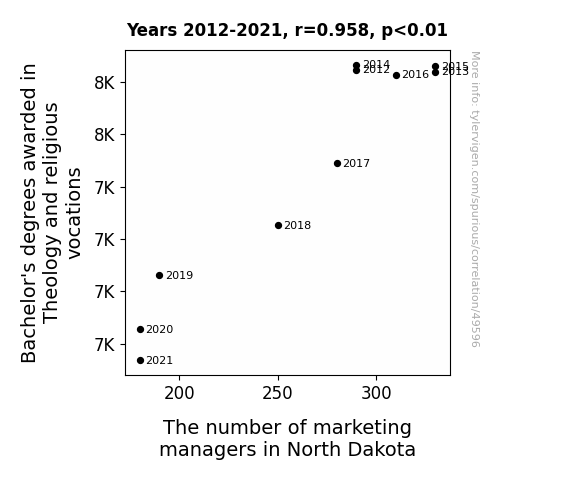 This means 91.7% of the change in the one variable (i.e., The number of marketing managers in North Dakota) is predictable based on the change in the other (i.e., Bachelor's degrees awarded in Theology and religious vocations) over the 10 years from 2012 through 2021.