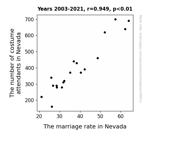 This means 90.1% of the change in the one variable (i.e., The marriage rate in Nevada) is predictable based on the change in the other (i.e., The number of costume attendants in Nevada) over the 19 years from 2003 through 2021.