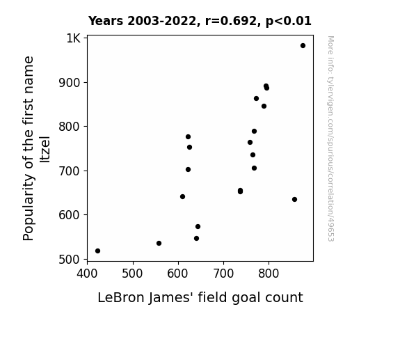 This means 48% of the change in the one variable (i.e., LeBron James' field goal count) is predictable based on the change in the other (i.e., Popularity of the first name Itzel) over the 20 years from 2003 through 2022.