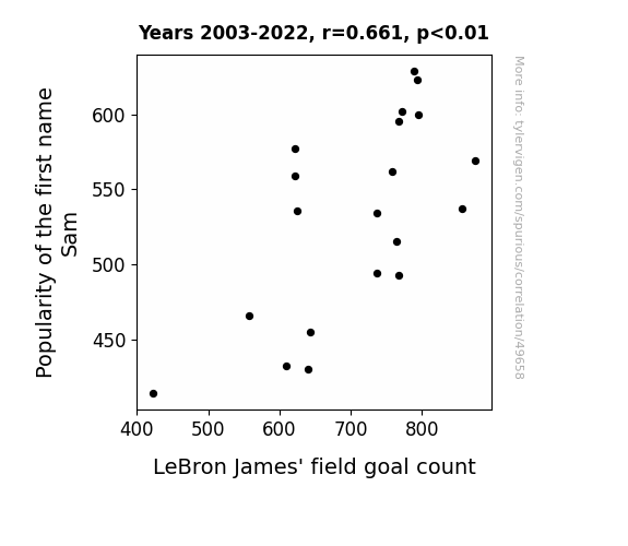 This means 43.7% of the change in the one variable (i.e., LeBron James' field goal count) is predictable based on the change in the other (i.e., Popularity of the first name Sam) over the 20 years from 2003 through 2022.