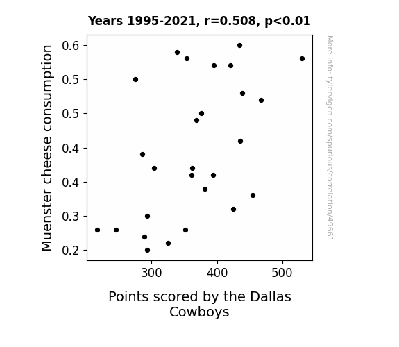 This means 25.8% of the change in the one variable (i.e., Points scored by the Dallas Cowboys) is predictable based on the change in the other (i.e., Muenster cheese consumption) over the 27 years from 1995 through 2021.