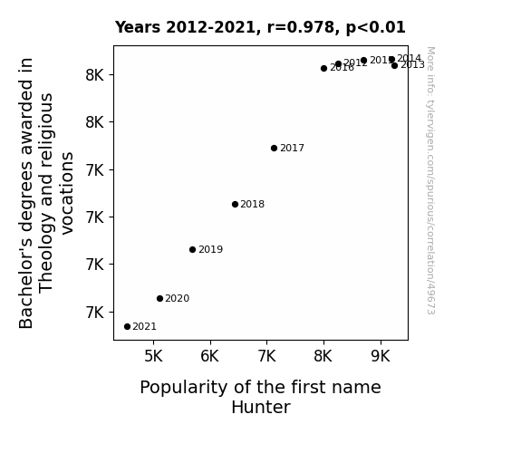 This means 95.7% of the change in the one variable (i.e., Popularity of the first name Hunter) is predictable based on the change in the other (i.e., Bachelor's degrees awarded in Theology and religious vocations) over the 10 years from 2012 through 2021.
