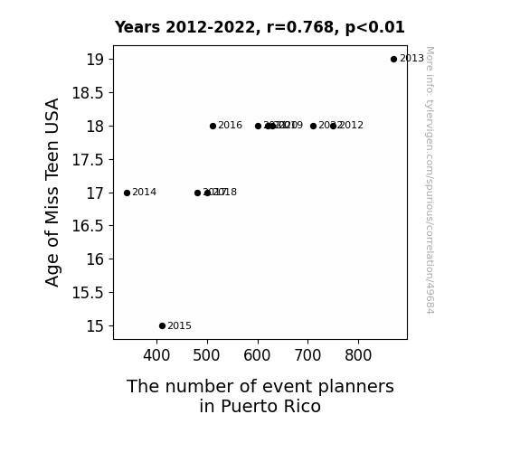 This means 59% of the change in the one variable (i.e., The number of event planners in Puerto Rico) is predictable based on the change in the other (i.e., Age of Miss Teen USA) over the 11 years from 2012 through 2022.