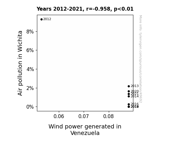 This means 91.9% of the change in the one variable (i.e., Wind power generated in Venezuela) is predictable based on the change in the other (i.e., Air pollution in Wichita) over the 10 years from 2012 through 2021.