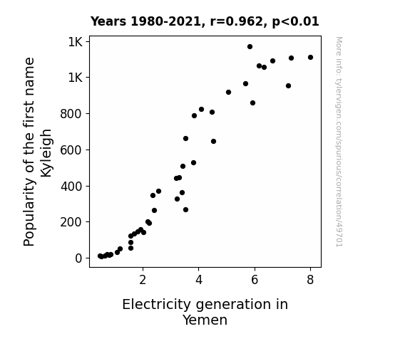 This means 92.6% of the change in the one variable (i.e., Electricity generation in Yemen) is predictable based on the change in the other (i.e., Popularity of the first name Kyleigh) over the 42 years from 1980 through 2021.