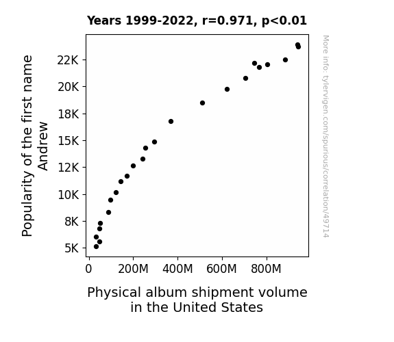 This means 94.4% of the change in the one variable (i.e., Physical album shipment volume in the United States) is predictable based on the change in the other (i.e., Popularity of the first name Andrew) over the 24 years from 1999 through 2022.