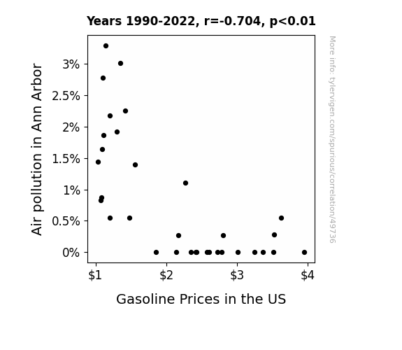 This means 49.6% of the change in the one variable (i.e., Gasoline Prices in the US) is predictable based on the change in the other (i.e., Air pollution in Ann Arbor) over the 33 years from 1990 through 2022.